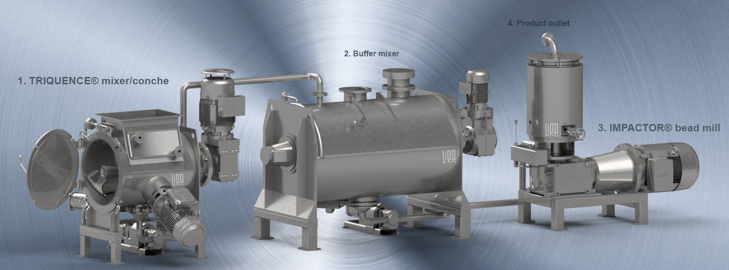 The system starts with the TRIQUENCE® mixer, which roughly conches raw materials and develops flavorings under the influence of temperature and shear forces. The mass enters a buffer mixer and then the desired fineness is set in the grinding process with the IMPACTOR® bead mill.