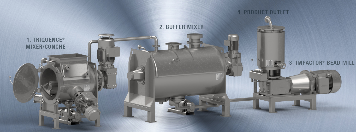 Das System beginnt mit dem TRIQUENCE®–Mischer, der Rohstoffe grob conchiert und Aromastoffe unter Temperatur- und Scherkrafteinfluss entwickelt. Die Masse gelangt in einen Puffer–Mischer und anschließend wird im Mahlprozess mit der Kugelmühle IMPACTOR® die gewünschte Feinheit eingestellt.